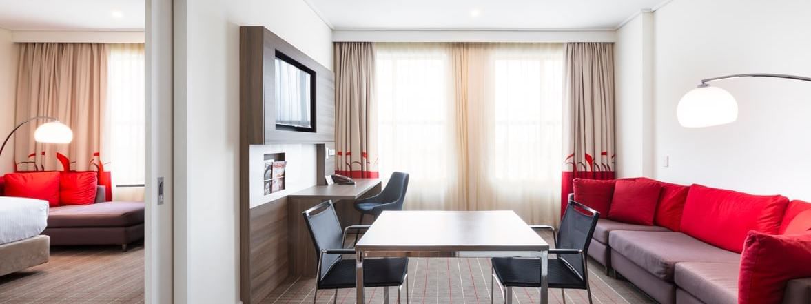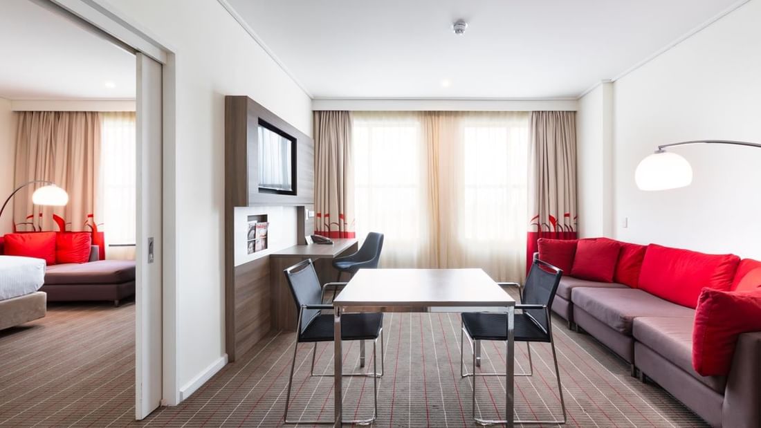 The Novotel Melbourne Glen Waverley's Superior King Suite features natural light, a separate area for conference or dining, a bay window and stunning views of the Dandenong Ranges. Located on the 5th and 6th floor, this luxury hotel suite is ideal for those seeking more space during their stay in Melbourne. With a large workstation, a luxury King size bed, NEXT furnishings, iPod docking station and a 32" flat screen TV, this hotel suite offers ultimate comfort, functionality and convenient amenities with every stay.